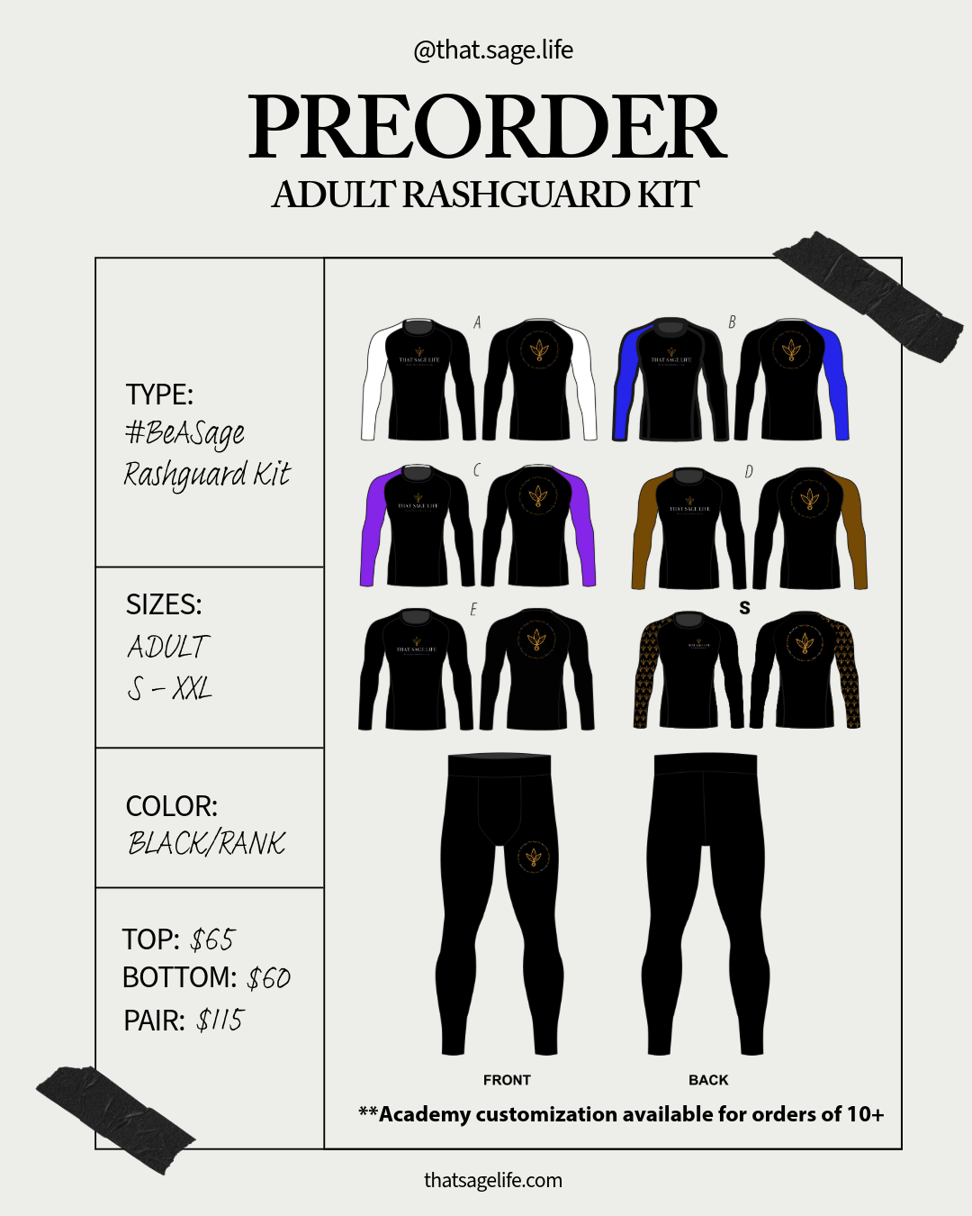 Step onto the mats with confidence in the #BeASage Ranked Jiu Jitsu Rashguard—built for durability, comfort, and performance. Designed to move with you, these rashguards feature a sleek fit and reinforced stitching to handle the toughest rolls while keeping you comfortable through training and competition.