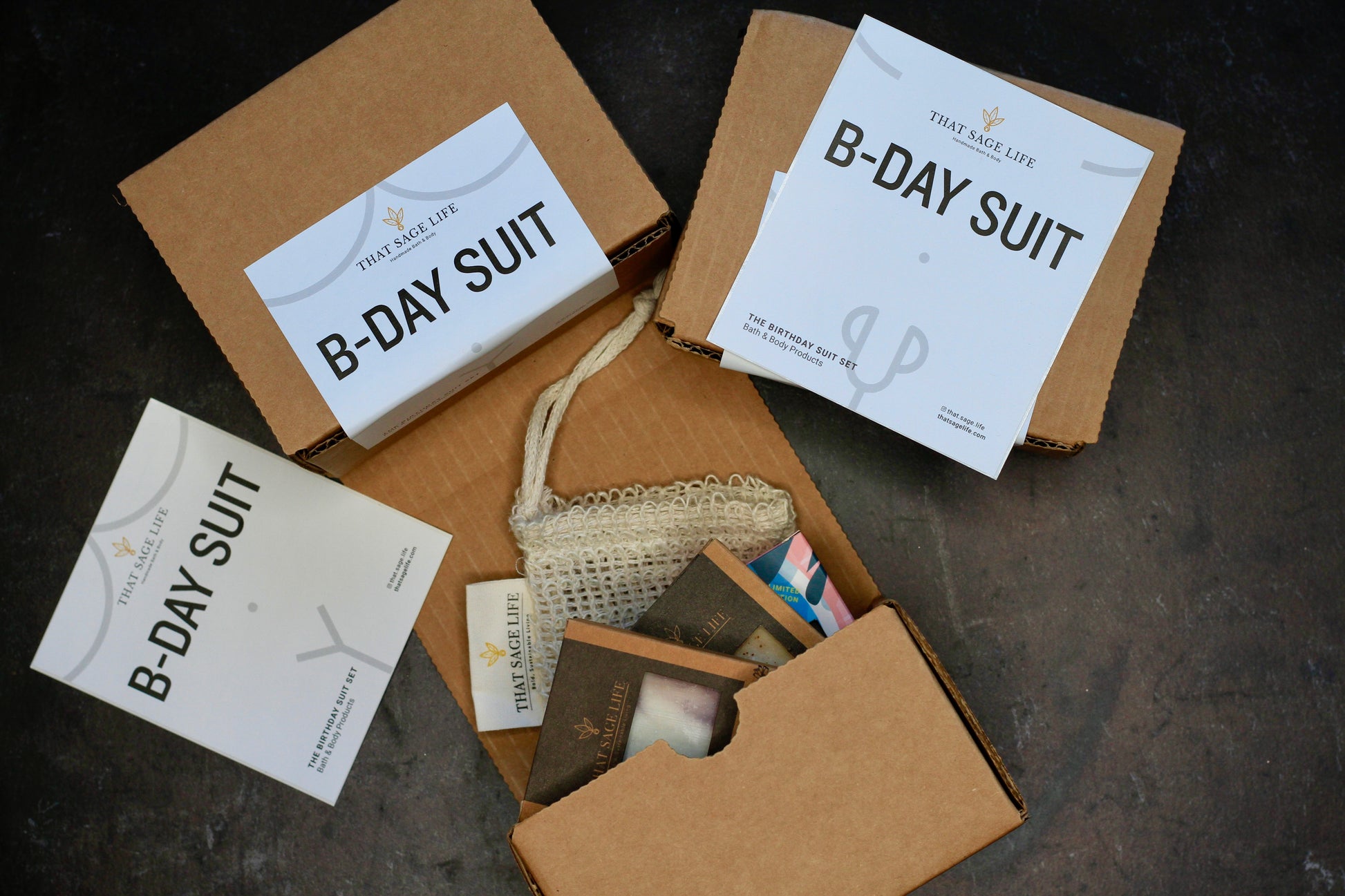 The Bday Suit Gift Set includes any three in-stock body bars and a biodegradable soap bag, with your choice of male or female-themed label.