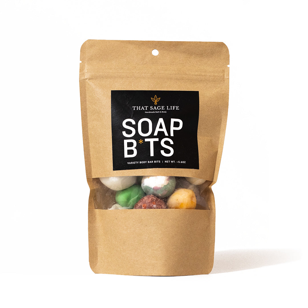Soap B*ts is a 5.6oz bag of a variety of soap balls and bits. It's the perfect little bag to get the idea of how our soap feels on your skin, a variety of scents, or even to take on a trip.