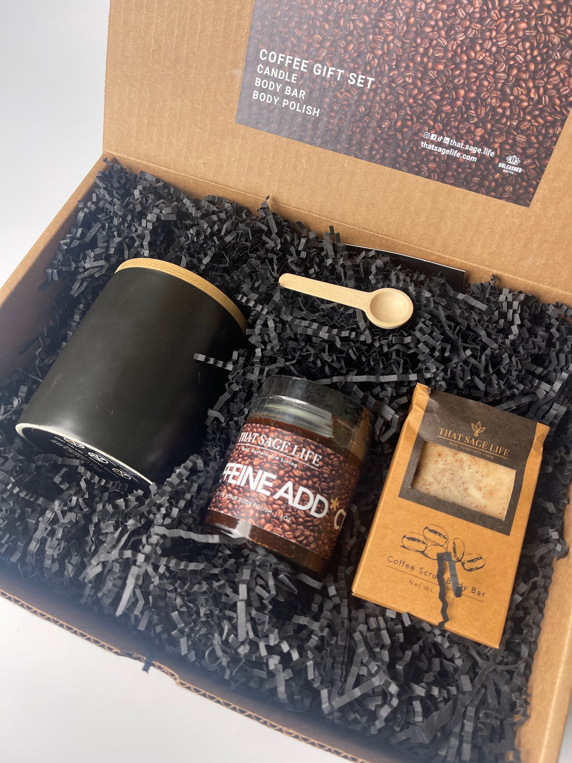 This Coffee gift set is the perfect gift for the coffee obsessed. It is an all-natural ingredient set that includes the coffee scrub body bar, coffee body polish, and a brewed coffee scented candle (and YES, it really does smell like a brewed cup of coffee.